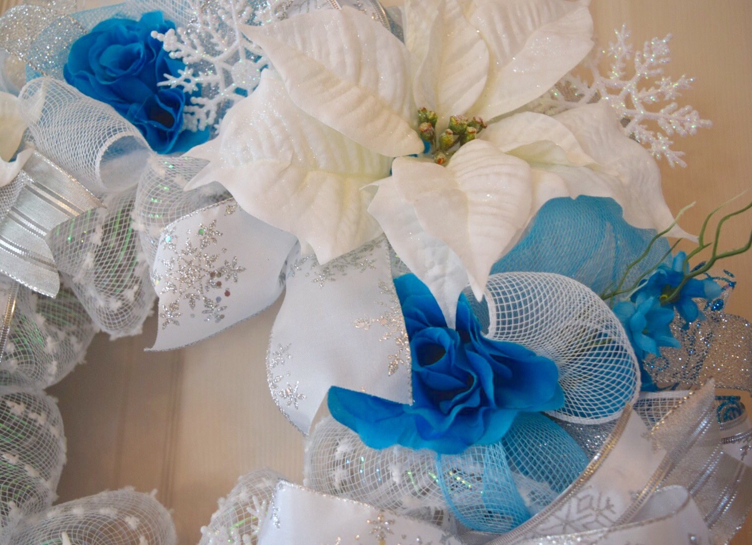 White And Turquoise Mesh Christmas Wreath With Poinsettias And