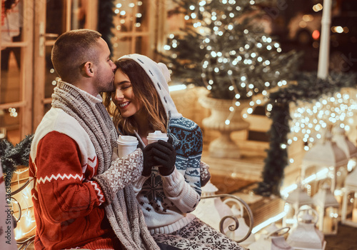 A Young Romantic Couple Wearing Warm Clothes Outdoor At Christmas