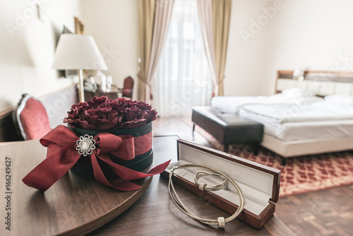 The romantic hotel room decoration with real rose petals candles and flowers.