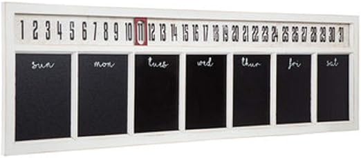 It features a distressed mdf frame a black chalkboard background and a white overlay marking each day of the week and month.