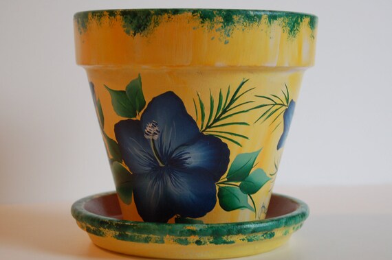 8 Hand Painted Clay Flower Pot Tropical Dark Blue Etsy