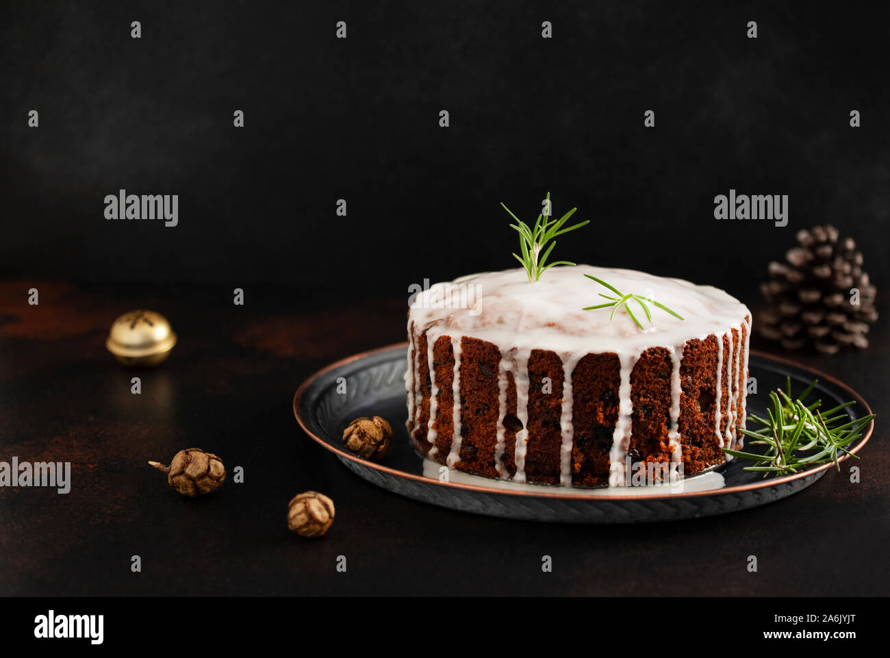 Traditional Christmas Cake With Fruits And Nuts On A Dark Table